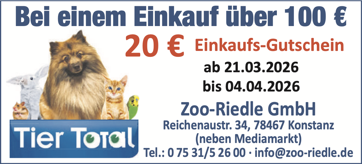 Alles was das Herz eines Tierfreundes höher schlagen lässt, hat Tier Total Zoo-Riedle in der Reichenaustr. 34 in Konstanz zu bieten. Die Stammkunden wissen es längst: Dieses renommierte und traditionsreiche Konstanzer Unternehmen ist das führende Zoo-Fachgeschäft in der Region. Kompetente Beratung, beste Auswahl, Qualität zum günstigen Preis und Rundum-Service für Ihre Heimtiere – dafür steht Tier Total Zoo-Riedle seit über 45 Jahren.