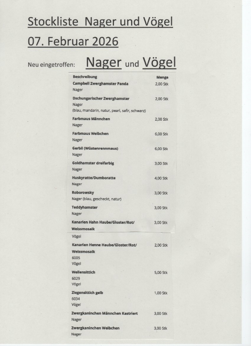 Stockliste Nager und Vögel 7.2.2026